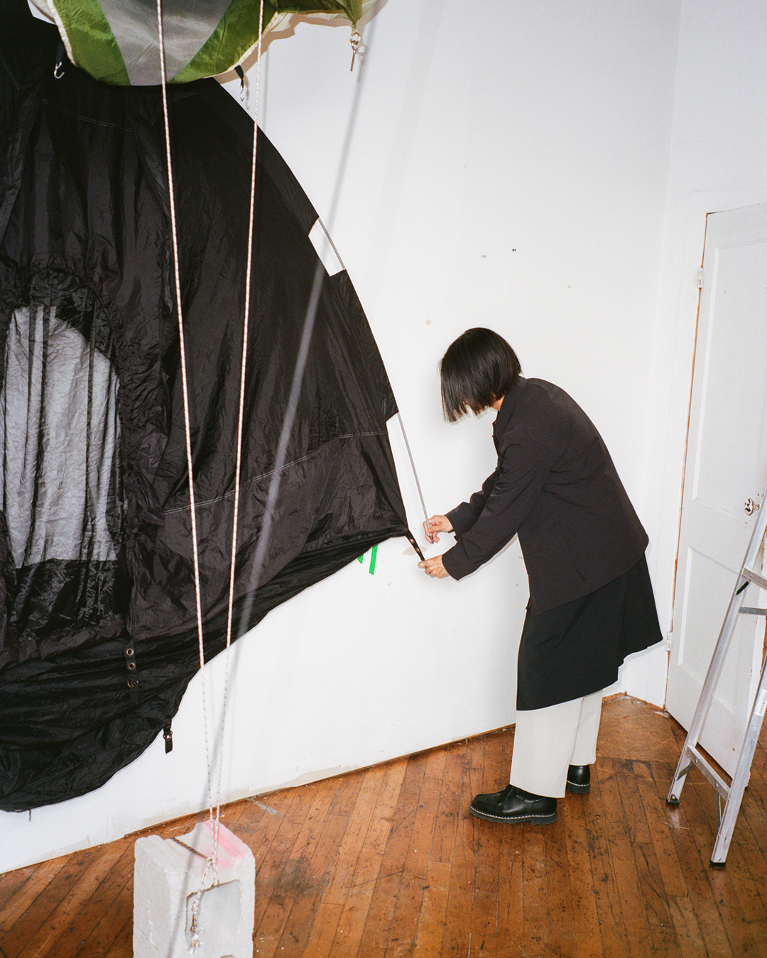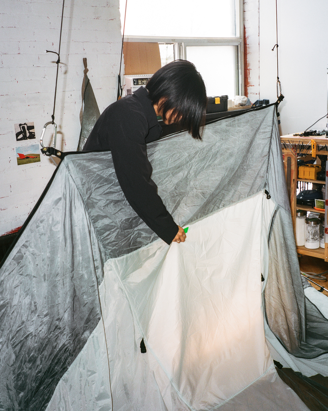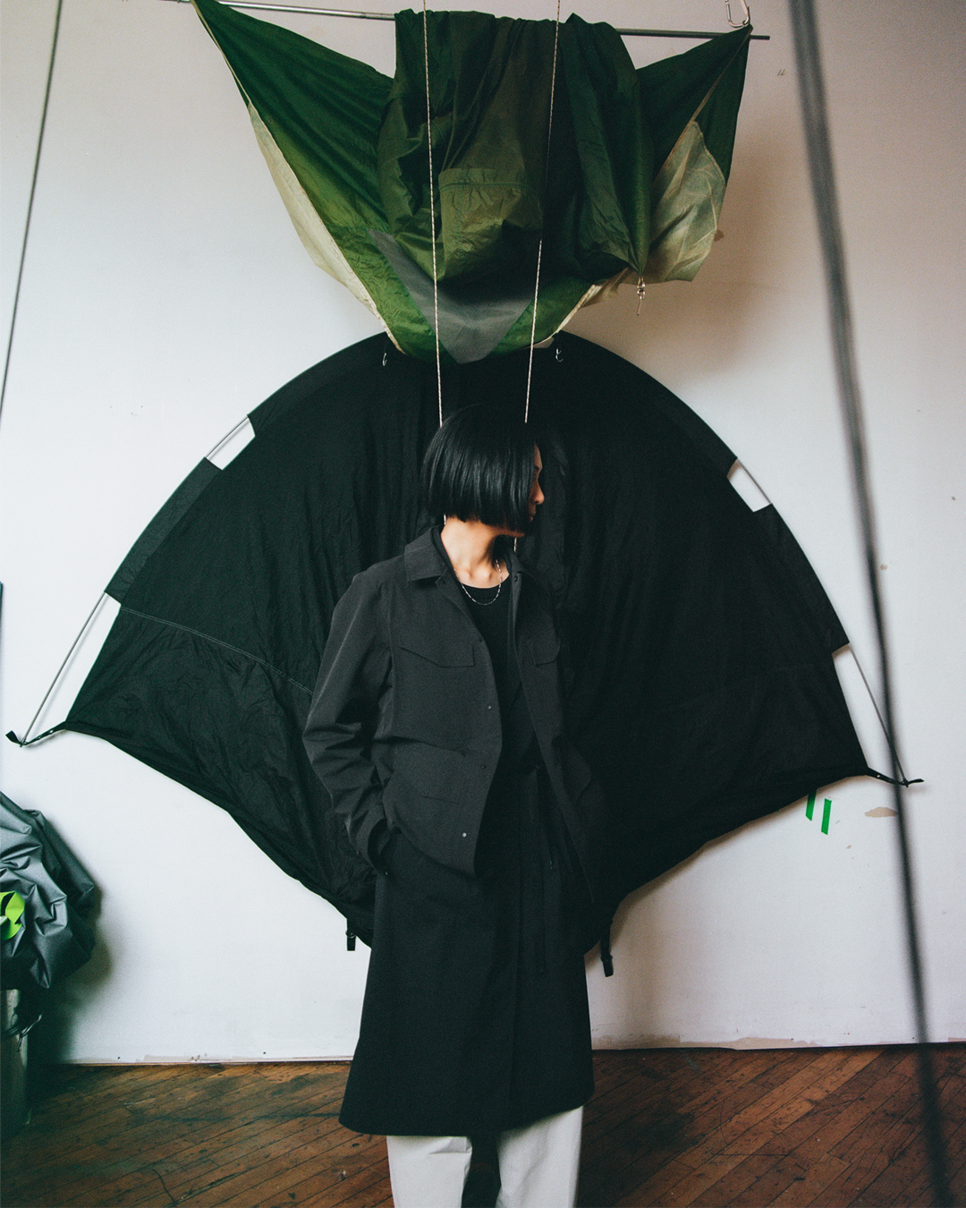 “con/temporary architecture, by Alyssa Alikpala, repurposes end-of-roll Gore-Tex in combination with other used and deadstock materials. Expanding on Veilance’s urban approach to technical wear, architectural form is explored as a collapsible and temporary space for gathering.”
